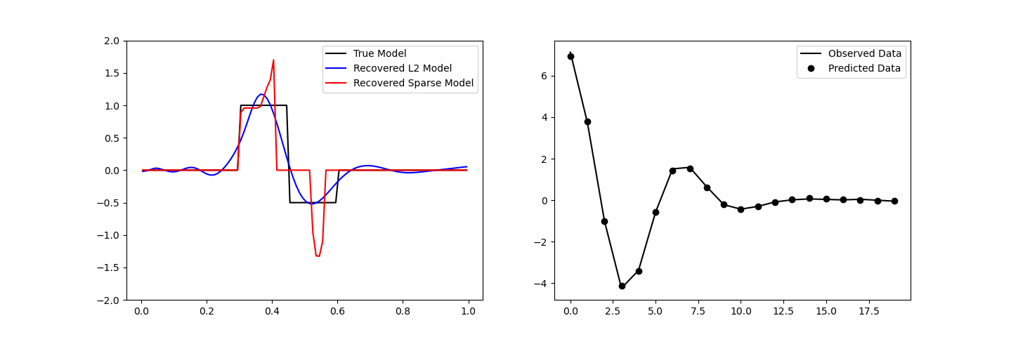 Least-squares inversion produces smooth models which may not be an accurate representation of the true model. Here we demonstrate the basics of inverting for sparse and/or blocky models. Here, we used the iteratively reweighted least-squares approach. For this tutorial, we focus on the following: