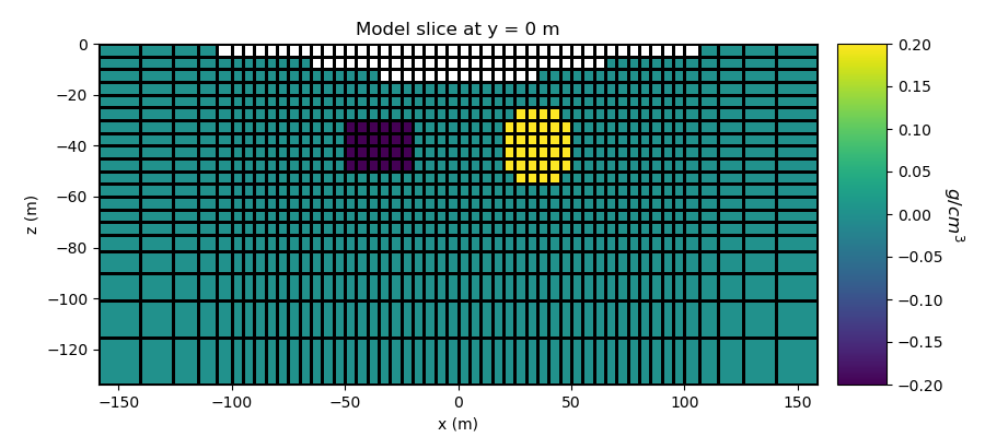 Compute predicted data for some model SimPEG uses right handed coordinate where Z is positive upward. This causes gravity signals look “inconsistent” with density values in visualization.