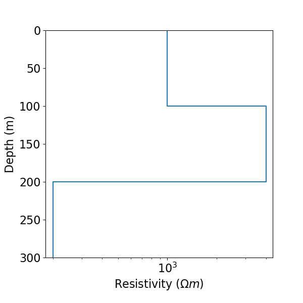 Here, we define the layer thicknesses and electrical resistivities for our 1D simulation. If we have N layers, we define N electrical resistivity values and N-1 layer thicknesses. The lowest layer is assumed to extend to infinity. In the case of a halfspace, the layer thicknesses would be an empty array.