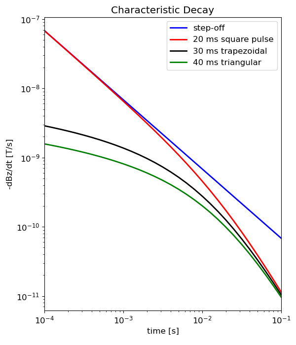 Under simpeg.electromagnetic.viscous_remanent_magnetization.waveform there are a multitude of waveforms that can be defined (Step-off, square-pulse, piecewise linear, …). Here we define a specific waveform for each transmitter. Each waveform is defined with a diferent set of parameters.