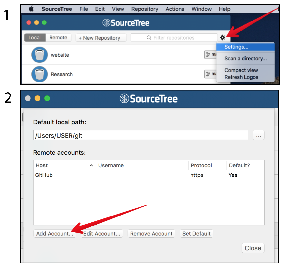 If this is your first time managing a github repository through SourceTree, it is also handy to set up the remote account so it remembers your github user name and password