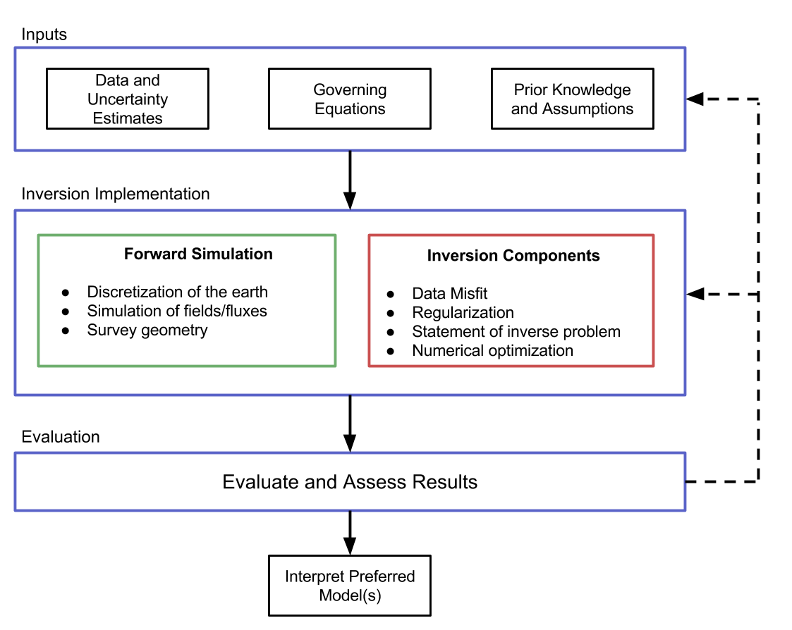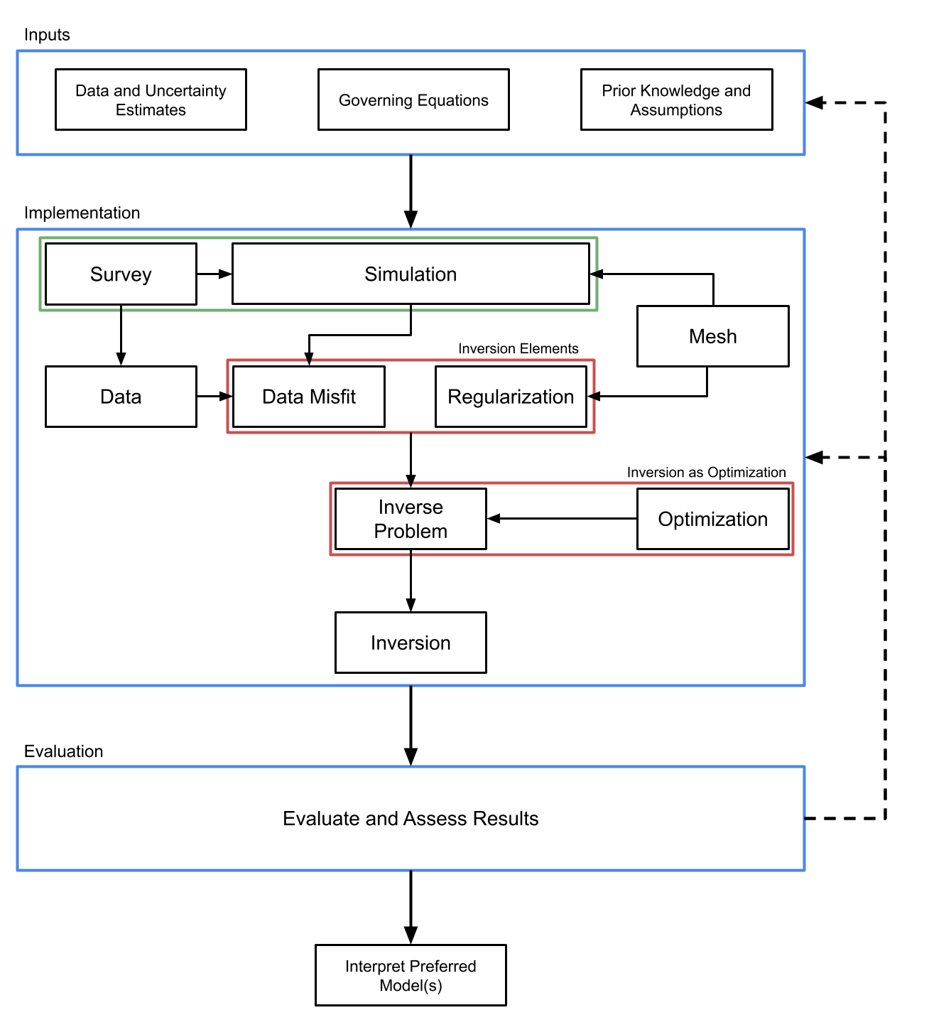 Defining a well-posed inverse problem and solving it is a complex task that requires many components that must interact. It is helpful to view this task as a workflow in which various elements are explicitly identified and integrated. The figure below outlines the inversion components that consists of inputs, implementation, and evaluation. The inputs are composed of the geophysical data, the equations which are a mathematical description of the governing physics, and prior knowledge or assumptions about the setting. The implementation consists of two broad categories: the forward simulation and the inversion. The forward simulation is the means by which we solve the governing equations given a model and the inversion components evaluate and update this model. We are considering a gradient based approach, which updates the model through an optimization routine. The output of this implementation is a model, which, prior to interpretation, must be evaluated. This requires considering, and often re-assessing, the choices and assumptions made in both the input and implementation stages.